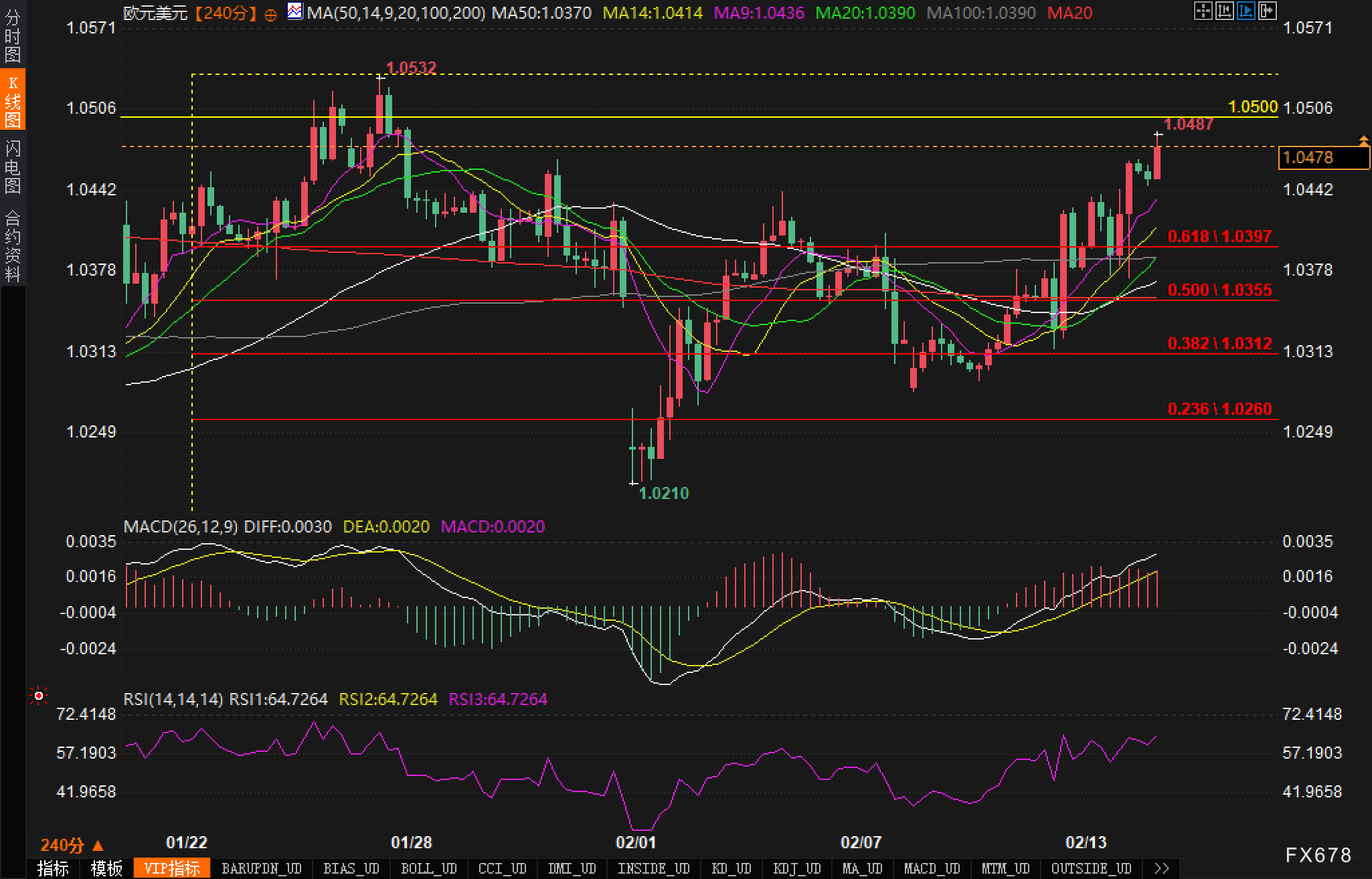 ③ 技术分析 - 5、欧元10和21日移动均线均呈上升趋势,美元XM外汇21日布林带区间扩大,创年长积日能量指标显示强烈的新高绪提上行倾向;突破12月高位1.0630和9月/1月跌势的50%回调位1.0669后,将成为主要阻力位,受德而周二低点1.0472和上周低点1.0360构成初步支撑;